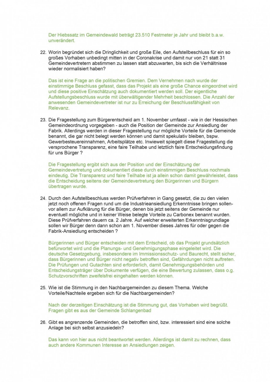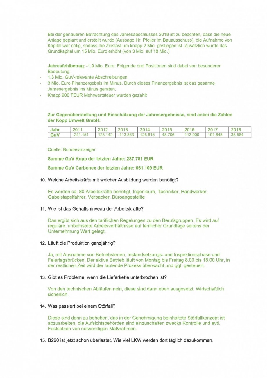 Durch den Aufstellbeschluss werden Prüfverfahren in Gang gesetzt, die zu den vielen jetzt noch offenen Fragen rund um die Industrieansiedlung Erkenntnisse bringen sollen- vor allem zur Aufklärung für die Bürger, denen bis jetzt seitens der Gemeinde nur eventuell mögliche und in keiner Weise belegte Vorteile zu Carbonex benannt wurden. Diese Prüfverfahren dauern ca. 2 Jahre. Auf welcher erweiterten Erkenntnisgrundlage sollen wir Bürger denn dann schon am 1. November dieses Jahres für oder gegen die Fabrik-Ansiedlung entscheiden ?