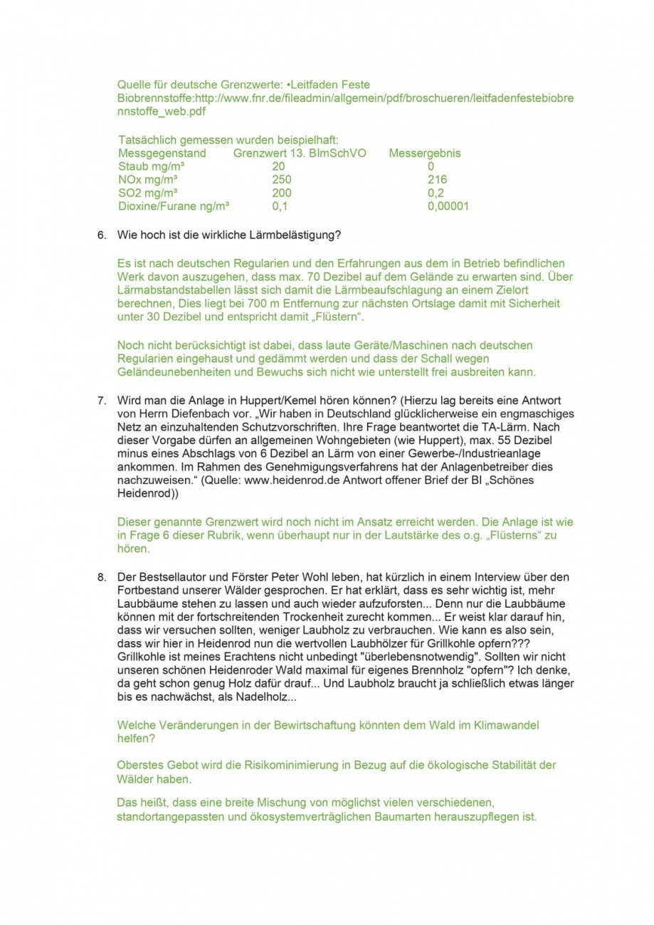 Wird man die Anlage in Huppert/Kemel hören können? (Hierzu lag bereits eine Antwort von Herrn Diefenbach vor. „Wir haben in Deutschland glücklicherweise ein engmaschiges Netz an einzuhaltenden Schutzvorschriften. Ihre Frage beantwortet die TA-Lärm. Nach dieser Vorgabe dürfen an allgemeinen Wohnge-bieten (wie Huppert), max. 55 Dezibel minus eines Abschlags von 6 Dezibel an Lärm von ei-ner Gewerbe-/Industrieanlage ankommen. Im Rahmen des Genehmigungsverfahrens hat der Anlagenbetreiber dies nachzuweisen.“ (Quelle: www.heidenrod.de Antwort offener Brief der BI „Schönes Heidenrod))